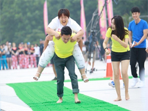 項目說明:(共四個不同規則的項目組成) 其中一項目規則:第一名運動員出發沖關,闖關完成后,將接力棒交給下一名隊員挑戰,以此類推,直至第四名隊員(男)背上第五名隊員(男)闖關完成比賽沖線,比賽結束,用時少者獲勝;參賽隊員不得穿鞋闖關。 項目收益: 1.通過相互配合快速增進人與人之間的關系,突破一些限制性觀念,培養團隊成員默契度和協作能力,體會融入團隊合作成功的成就感。 2. 隊員精神集中,團隊氣氛熱烈,加強團隊融合。培養信任感、責任感,并且打破了人與人之間的隔閡。